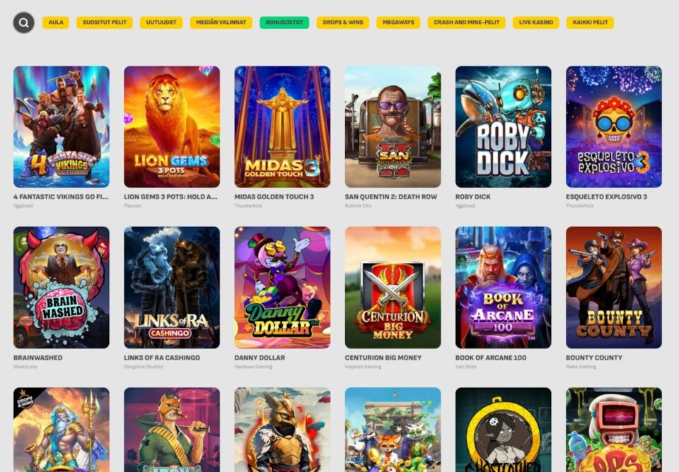 Pelit on jaoteltu toimivasti kategorioihin kuten Megaways-pelit, bonusostot, Drops & Wins sekä Crash- ja Mine-pelit. Demo-tilassa voi testata pelejä ennen oikean rahan pelaamista.