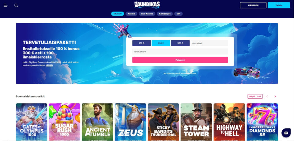 Vauhdikkaan tervetuliaisbonuskoodi on 100% bonus 300 euroon asti sekä 100 ilmaiskierrosta Big Bass Bonanza -peliin. Bonuksen saa bonuskoodilla VAUH.